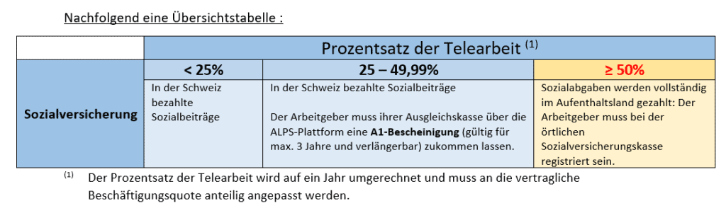 Als Arbeitgeber in der Schweiz liegt es in Ihrer Verantwortung, den Anteil der Telearbeit Ihrer Angestellten zu überwachen und gegebenenfalls eine A1-Bescheinigung zu beantragen, um die Unterstellung unter das schweizerische Sozialversicherungssystem nachzuweisen.