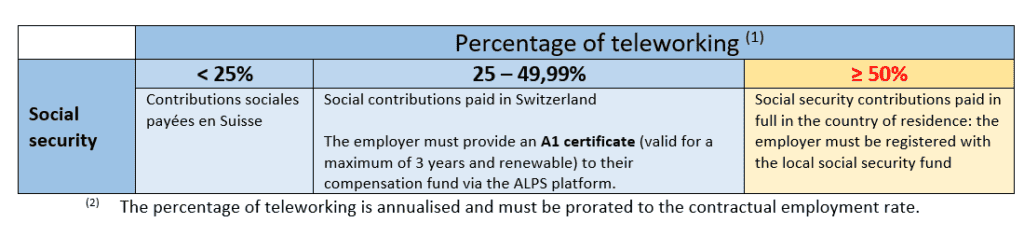 As an employer in Switzerland, it is your responsibility to monitor the percentage of your employees who telework and, if necessary, to request an A1 certificate to prove that they are covered by the Swiss social security system.